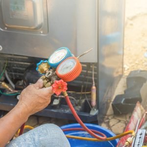 Checking refrigerant levels and adjusting pressures for optimal cooling.